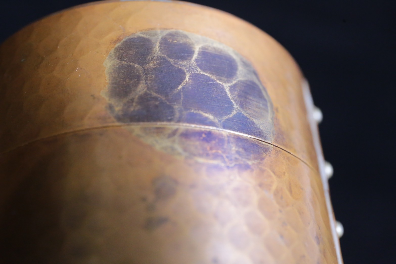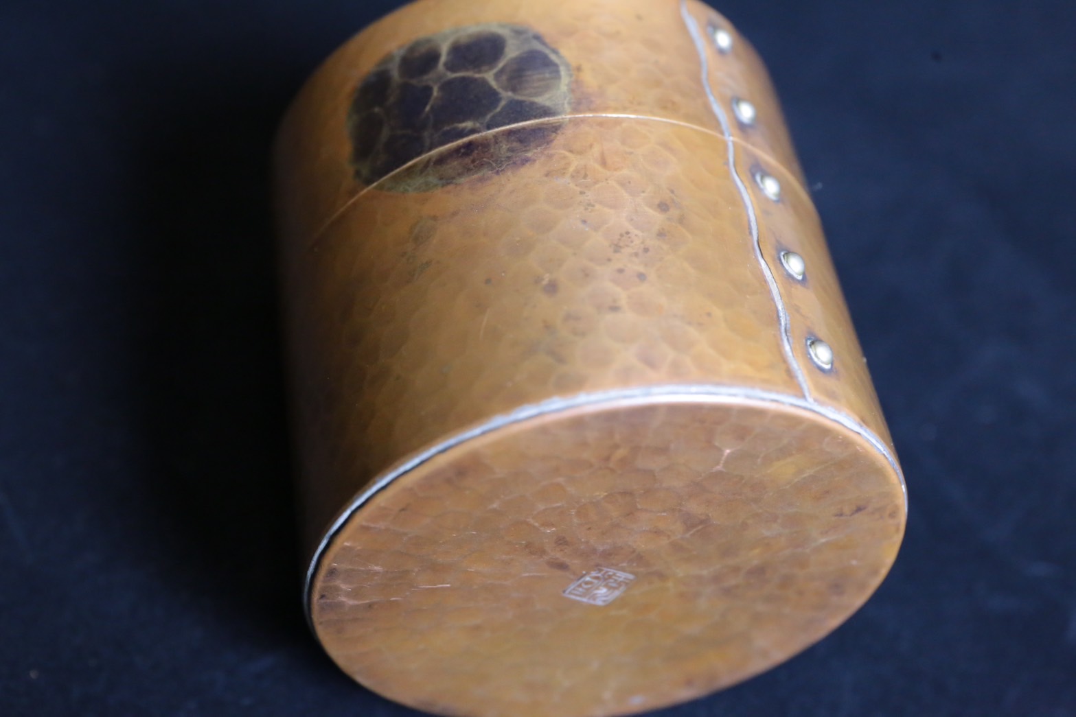 日本 玉川堂 位在新瀉縣,創立於1816年,200多年來,製作 的銅器產品,都是手工鎚起,作品精良,多受皇室採用做為禮品。 產品受政府訂為無形文化財產。 本件 龜甲紋茶倉 目前已是骨董級,昭和時期 。 小巧好攜帶 直徑7.8公分 高7.3公分 非常有質感,是戶外茶事的好物。 售價:4500元